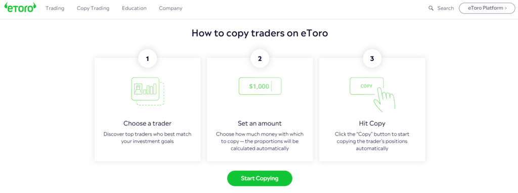 You pick a trader from eToro’s leaderboard, someone whose style and performance match what you’re after, set the amount you want to allocate (the minimum is $200), and from that point on, your account mirrors their trades automatically.